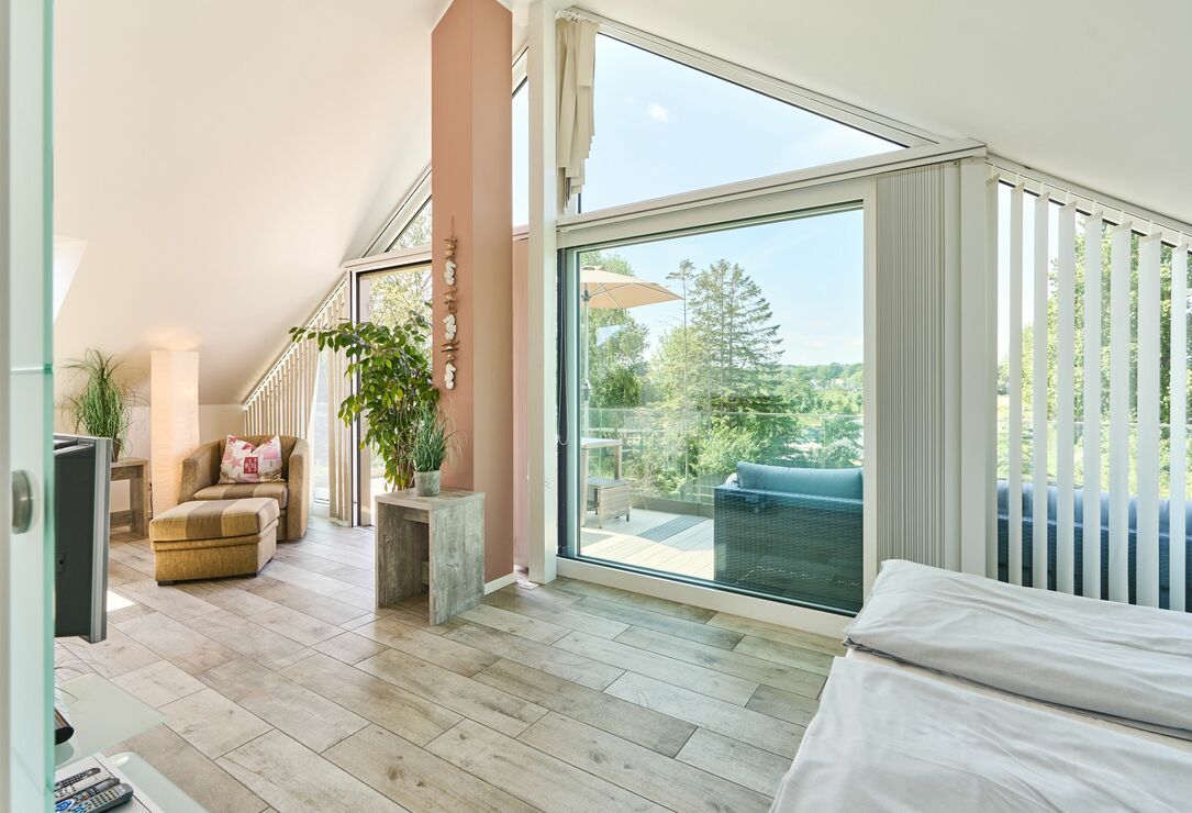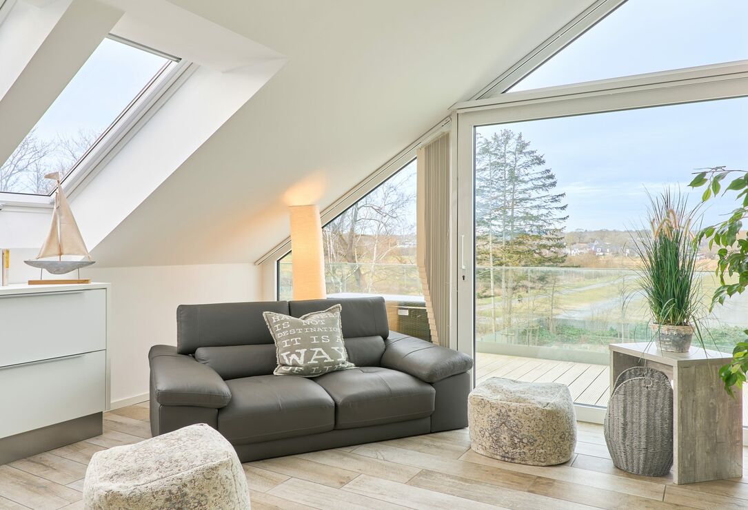 Es erwartet Sie schon beim Betreten der Wohnung ein weiter Blick in die Ferne. Diese Traumwohnung ist durch die bodentiefen Fenster absolut hell und lichtdurchflutet, selbstverständlich ist bei Bedarf ein Sichtschutz vorhanden. Der lichtdurchflutete Raum bietet Ihnen einen Essbereich mit Küchenzeile, einen gemütlichen Wohnbereich sowie einen Schlafbereich mit einem Doppelbett (1,60 x 2,00 m, Einzelmatratzen). Die Küche ist komplett ausgestattet und lässt keine Wünsche offen. Neben einem Flach-TV steht Ihnen selbstverständlich kostenloses WLAN zur Verfügung. Das Tageslicht-Bad verfügt über eine bodentiefe Dusche und einen Handtuchheizkörper sowie Fußbodenheizung.