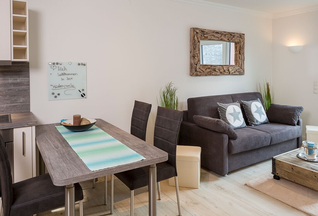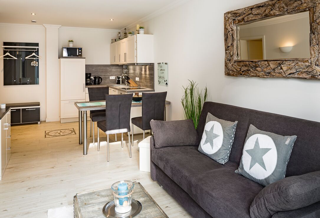 Diese schöne Ferienwohnung ist durchgehend mit einem Bodenbelag in angenehmer Holzoptik und Fußbodenheizung ausgestattet. Der Wohnraum verfügt über einen Ess- sowie einen gemütlichen Sitzbereich. Die Couch lässt sich mit nur wenigen Handgriffen in eine bequeme Schlafcouch (1,40 x 2,00m) umfunktionieren. Neben dem Flachbildfernseher steht Ihnen eine moderne HiFi-Anlage zur Verfügung. Kostenloses WLAN ist selbstverständlich. Die offene Küche ist ausgestattet mit u.a. Geschirrspüler, Backofen und Induktionskochfeld, Kühlschrank mit Gefrierfach. Neben einer Filterkaffeemaschine steht zusätzlich eine Nesprosso-Kapselmaschine für Sie bereit. Das Schlafzimmer ist mit einem Kleiderschrank und einem komfortablen Boxspringbett (1,80 x 2,00m) sowie einem Flachbildfernseher ausgestattet. Ein schönes Badezimmer mit bodentiefer Dusche mit Regendusche, zusätzlichem Handtuchheizkörper, Föhn und Waschmaschine erwartet Sie. Ein Abstellraum gehört ebenfalls zur Wohnung.