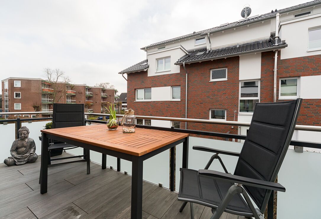 Der Balkon, Richtung Süden, mit hochwertigem Tisch und Stühlen lädt zu entspannten Stunden ein.