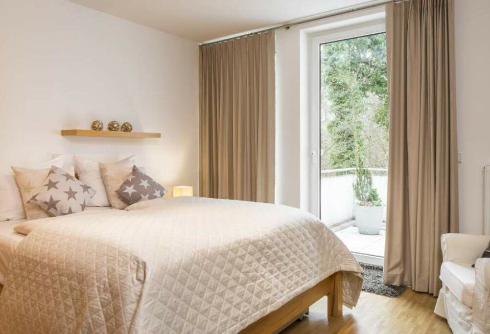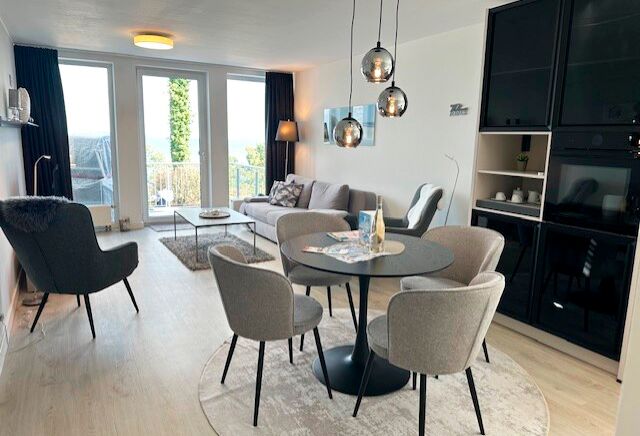 Diese helle 3-Zimmer-Ferienwohnung bietet Ihnen neben dem traumhaften Blick auf die Lübecker Bucht auch den Blick ins Grüne, mit Nachmittagssonne. Der Wohn- und Essbereich ist geschmackvoll und freundlich eingerichtet und verfügt über ein bequemes Sofa, welches sich in wenigen Handgriffen zu einem Schlafsofa umgestalten lässt, und zwei Sessel. Kostenloser WLAN-Zugang, Flachbildfernseher. Vom Wohnzimmer treten Sie hinaus auf den ersten Balkon (Richtung Süd/Osten), hier empfängt Sie ein phantastischer Meerblick, den Sie vom dort befindlichen Strandkorb genießen können. Die offene Küche ist in den Wohn-Essbereich integriert. Das erste Schlafzimmer verfügt über den Zugang zum zweiten Balkon. Das Schlafzimmer ist mit einem Doppelbett (1,60 x 2,00m), einem Kleiderschrank sowie mit einer Anrichte / TV ausgestattet. Auf dem 2. Balkon Richtung Südwest können Sie den Blick ins Grüne und die Mittags- bzw. Nachmittagssonne genießen. Das zweite Schlafzimmer verfügt über ein sehr bequemes Schrankbett (1,40 x2,00m). Hier haben Sie die Möglichkeit, den Raum tagsüber z. B. für Ihre Kinder als Spielzimmer oder als Lesezimmer zu nutzen. Selbstverständlich steht Ihnen auch hier ein TV-Gerät zur Verfügung. Das in heller Optik gehaltene Badezimmer ist mit einer Wanne mit Duschvorrichtung ausgestattet.