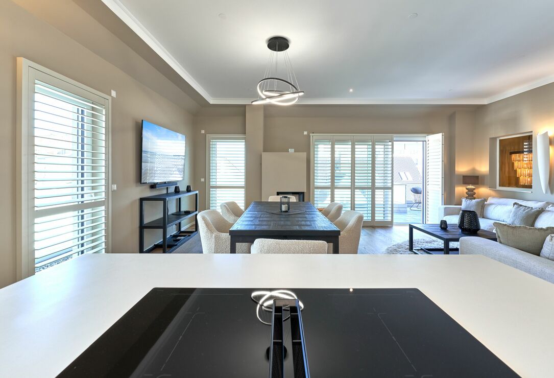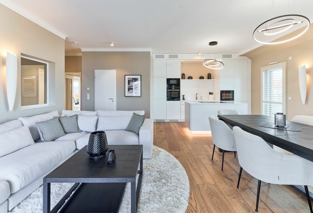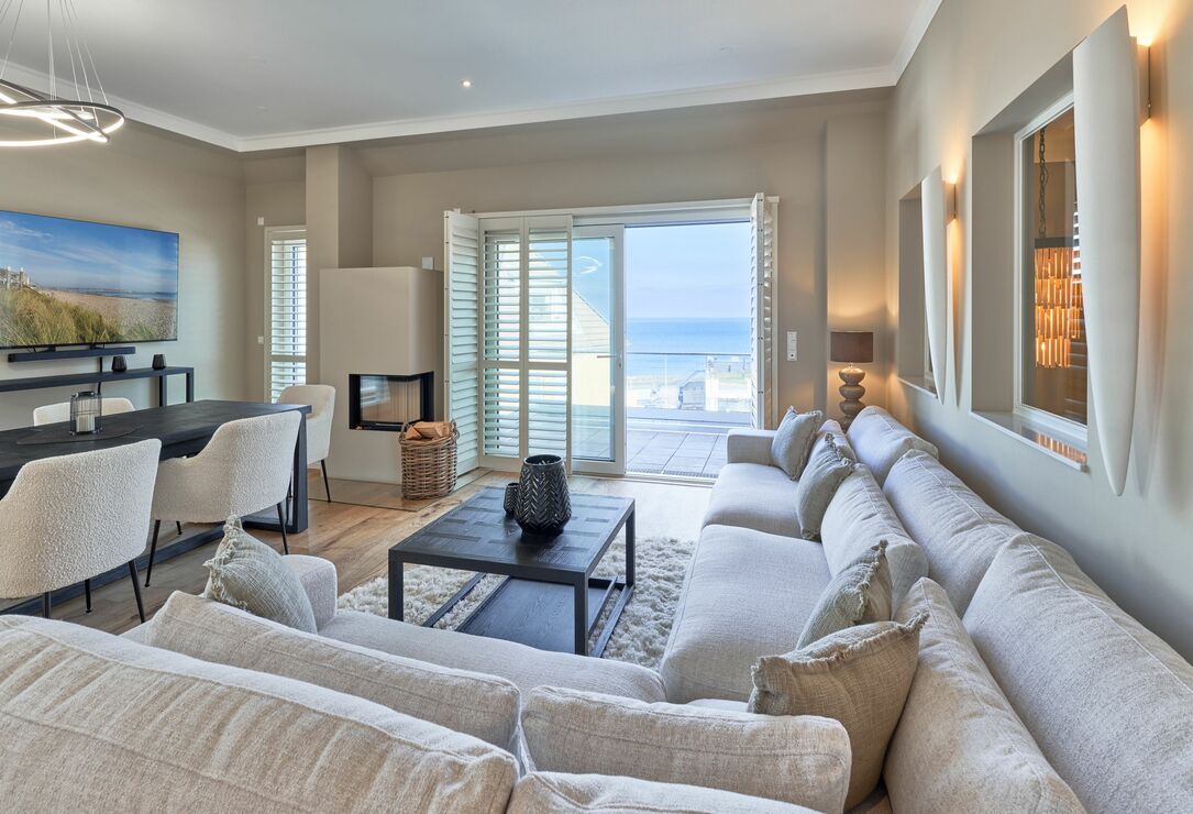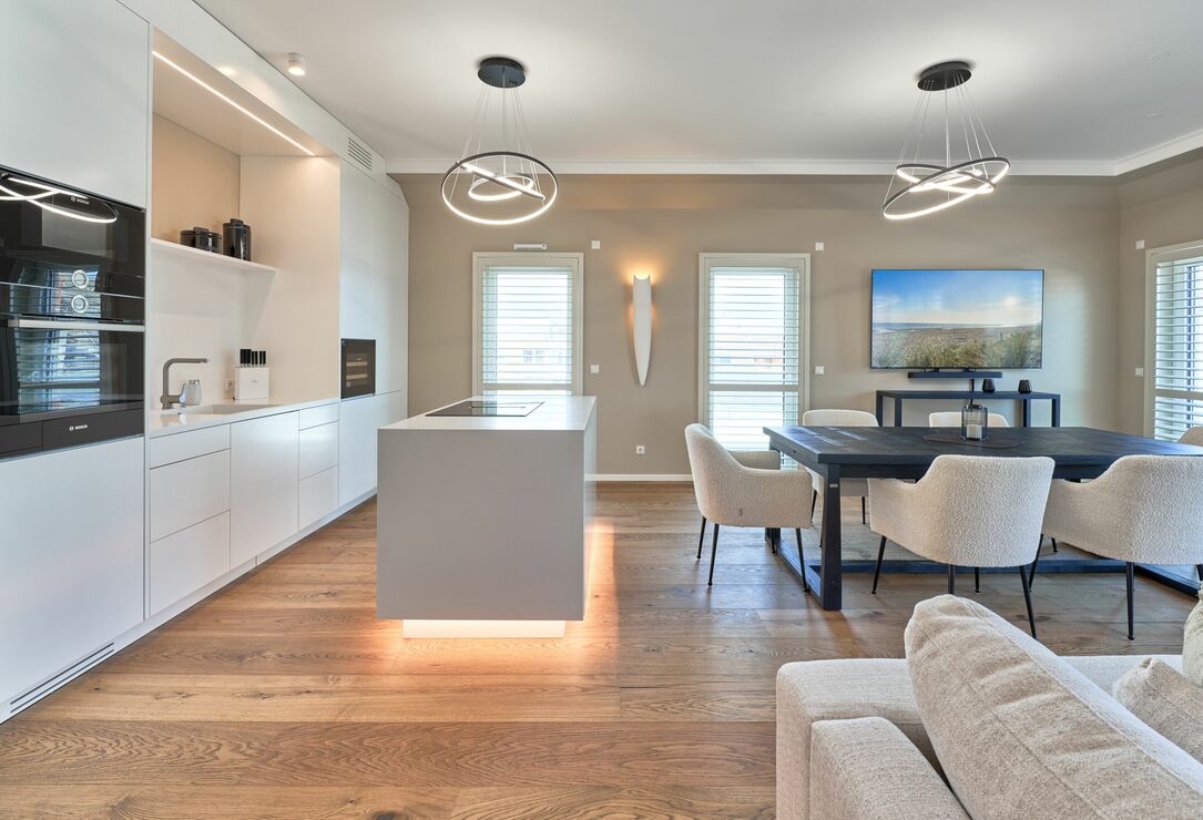 Der Wohn-Essbereich bietet Ihnen bei der Größe von ca. 50m² ein angenehmes Flair. Es erwartet Sie eine voll ausgestattete Küche. Die Kochinsel lädt Sie und Ihre Lieben herzlich zum gemeinsamen Kochen ein. Ein Weinklimaschrank sorgt für die ideale Temperatur Ihres Lieblingsweins. Alle weiteren Annehmlichkeiten wie Spülmaschine, Mikrowelle, Induktionsherd, Backofen, Gefrierschrank, Kaffee- und Nespresso-Maschine und vieles mehr sind für Sie in der Wohnung vorhanden. Der Esstisch bietet Ihnen genügend Platz, auch für fröhliche Spieleabende. Sitzen oder liegen Sie gerne auf der feinen Sofalandschaft? Hier dürfen Sie beides in voller Gemütlichkeit genießen. Kuscheln Sie sich in weiche Decken und verbringen Sie Ihre Abende vor dem wärmenden Kamin. Kuschelfaktor pur! Für das Technische ist selbstverständlich auch gesorgt. Der 75-Zoll-Smart-TV, W-LAN, 100 MBit sowie ein Soundbar-System, welches per Bluetooth gesteuert werden kann. Die vier Schlafzimmer sind je mit einem Smart-TV(43 bis 55 Zoll) ausgestattet. Die Wohnung hat einen Büroraum, hier steht ein PC-Bildschirm zum Andocken bereit. Die Tageslichtbäder sind je mit einer bodentiefen Regendusche sowie mit einem Handtuchheizkörper ausgestattet, auch Waschmaschine und Trockner stehen bereit. Des Weiteren befinden sich noch zwei Gästetoiletten in der Wohnung. Wünschen Sie Wellness, ohne Ihren Wohlfühlort zu verlassen? Bitte sehr – auch hier haben die Eigentümer keine Wünsche offen gelassen. Sauna, Dampfdusche, Infrarotkabine, Badewanne und Relax-Bereich. Genießen Sie einen Blick auf die Ostsee!