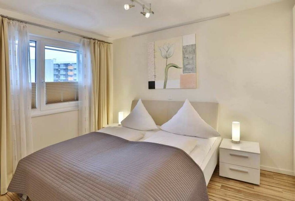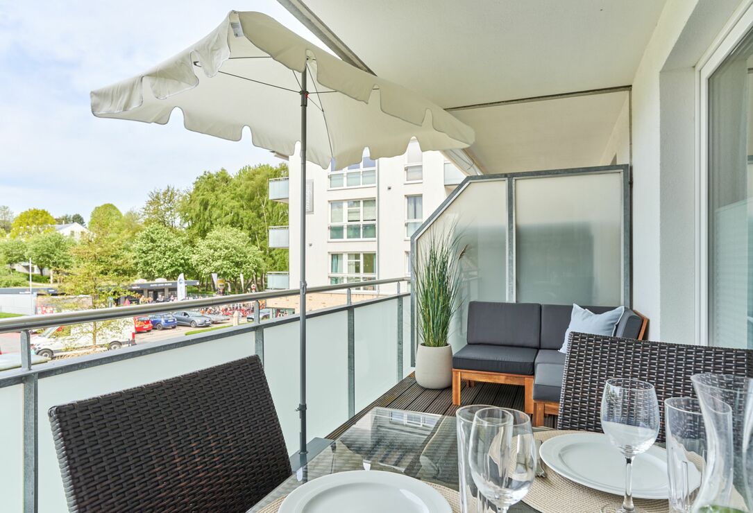 Helle und freundliche 3-Zimmer-Ferienwohnung, ca. 67 m², für bis zu 4 Personen, Westbalkon, Duschbad mit Waschmaschine. Tiefgaragenstellplatz, Einfahrtshöhe 1,98 m, Lademöglichkeit für elektrische Fahrzeuge, Fahrstuhl