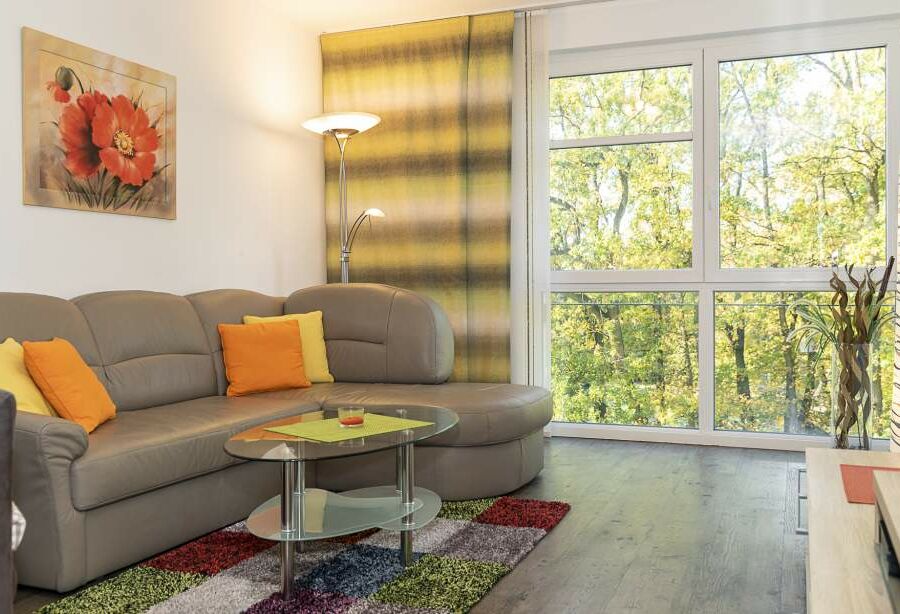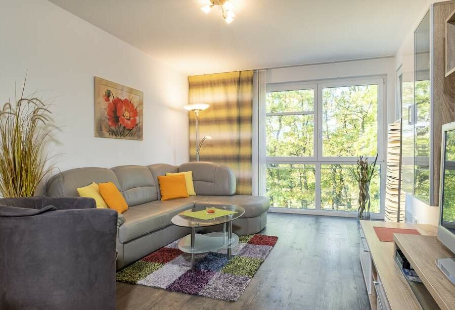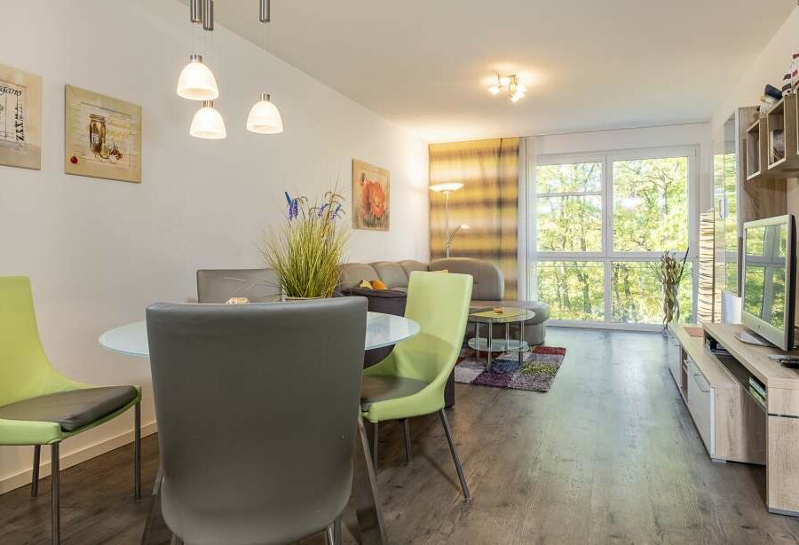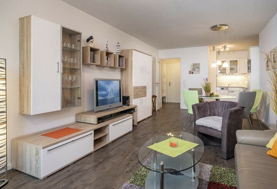Der helle Wohnbereich mit bodentiefen Fenstern bietet einen Essplatz für 4 Personen, ein gemütliches Sofa, das sich mit wenigen Handgriffen in eine Schlafcouch (1,70 x 2,00m) verwandeln lässt, einen Flachbild-TV, WLAN, eine iPod-Dockingstation, einen Blue-Ray-Player, eine Stereoanlage und einen Safe. Die voll ausgestattete Küche lässt keine Wünsche offen. Vom Balkon aus hat man einen seitlichen Blick aufs Meer und die Aussicht in den Kurpark. Ein komfortables Doppelbett (1,80 m x 2,00 m) sorgt im Schlafzimmer für eine erholsame Nachtruhe. Hier finden Sie den zweiten Flachbild-TV. Im Badezimmer mit bodengleicher Dusche ist auch die Waschmaschine untergebracht. Die Wohnung liegt direkt gegenüber dem Kurpark, nur wenige Schritte von der Fußgängerzone und der Ostsee entfernt. Sie verfügt über einen Safe und einen abschließbaren Fahrradkeller.