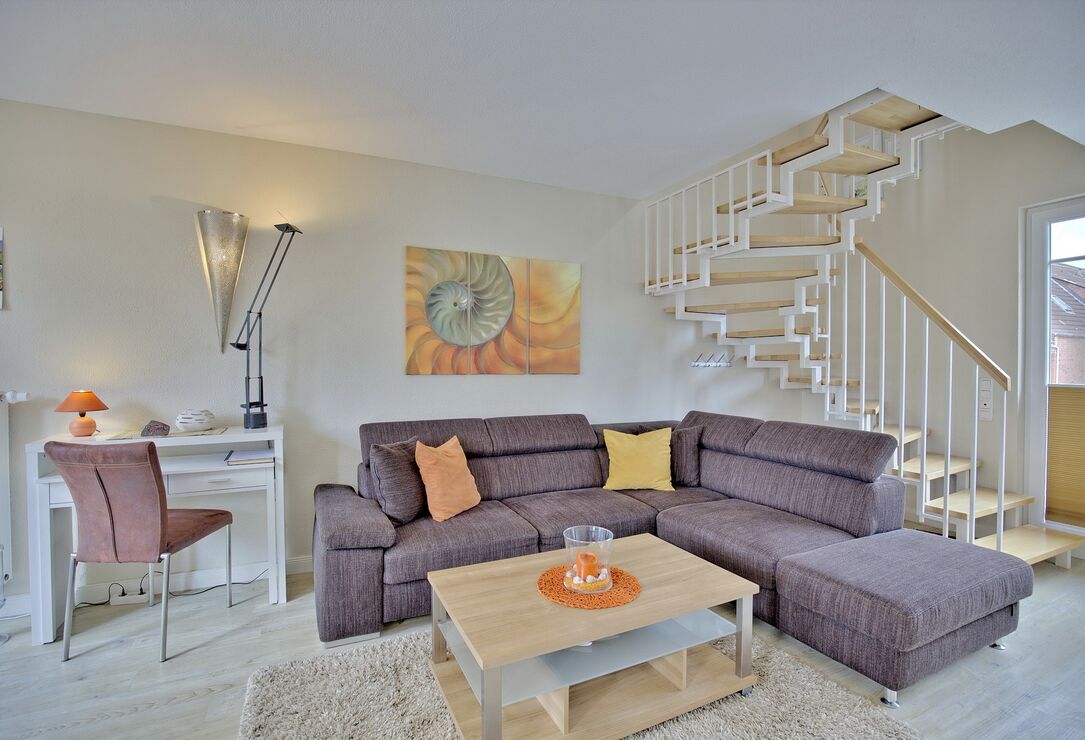 Der helle Wohn-Essbereich bietet Ihnen eine gemütliche Sofaecke und einen Esstisch. Das Sofa lässt sich mit wenigen Handgriffen in ein bequemes Schlafsofa umfunktionieren. Neben dem Flachbildfernseher, dem DVD-Player und einem CD-Player steht Ihnen selbstverständlich kostenloses WLAN zur Verfügung. Die helle Küche ist komplett ausgestattet. Über eine Treppe gelangen Sie auf die zweite Ebene. Hier erwarten Sie ein Tageslicht-Duschbad mit XXL-Dusche und ein Schlafzimmer mit Doppelbett, geräumigem Kleiderschrank und Flachbildfernseher. Beide Dachterrassen liegen in Südwestlage. Hier begleitet Sie die Sonne bis in die Abendstunden und Sie können entspannt Ihr Frühstück, Mittag- oder Abendessen mit Blick in den Kurpark genießen. Ausgestattet sind sie mit Tisch, Stühlen, Liegen und Sonnenschutz.