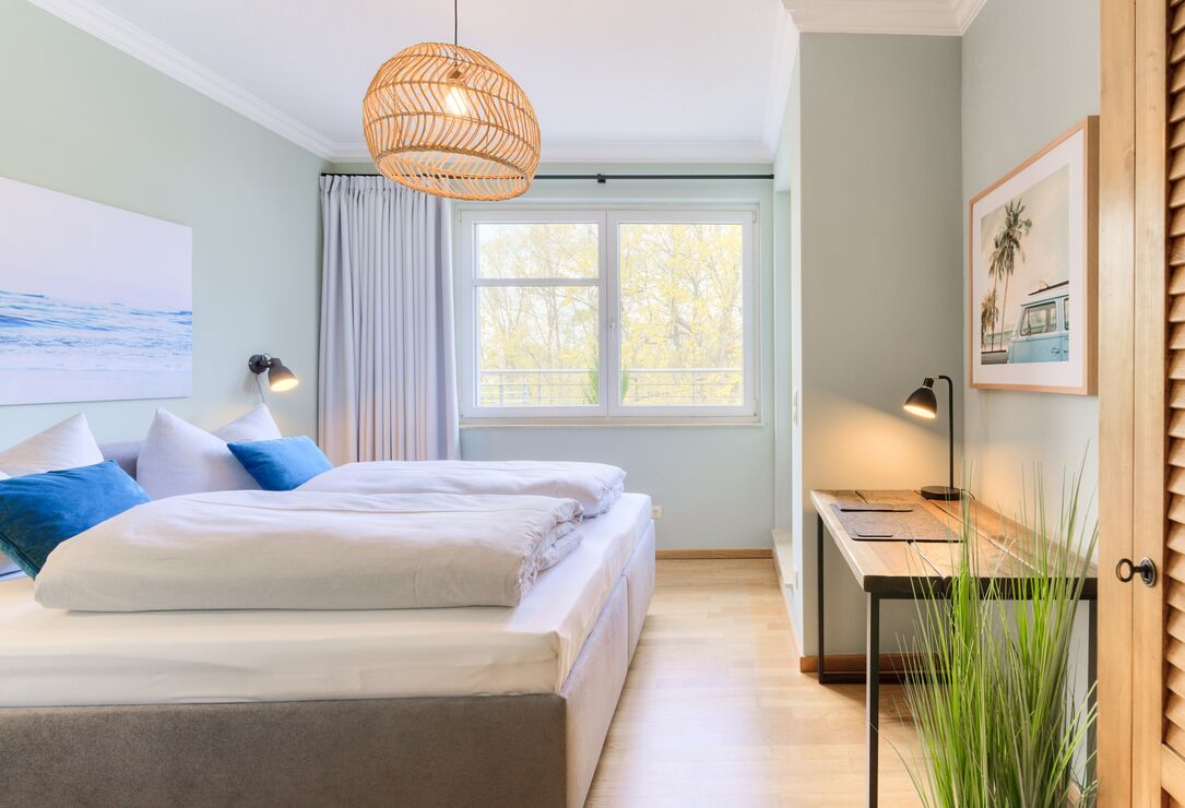 Im 1. Schlafzimmer stehen ein bequemes Doppelbett (1,60 x 2,00m) sowie ein geräumiger Schrank zur Verfügung. Ein kleiner Schreibtisch rundet das Strandambiente in diesem Zimmer ab. Auch aus diesem Zimmer können Sie den Blick auf das Meer genießen. Im zweiten, etwas größeren Schlafzimmer gibt es neben einem Boxspringbett (1,80 x 2,00m) und einem Smart-TV auch ein angrenzendes Ankleidezimmer. Von beiden Schlafzimmern aus gelangen Sie auf die Dachterrasse. Zur Verdunkelung sind Verdunklungsvorhänge angebracht. Das Tageslichtbad verfügt über eine Dusche sowie über eine Waschmaschine. Neben der Fußbodenheizung ist hier ein zusätzlicher Handtuchheizkörper angebracht.