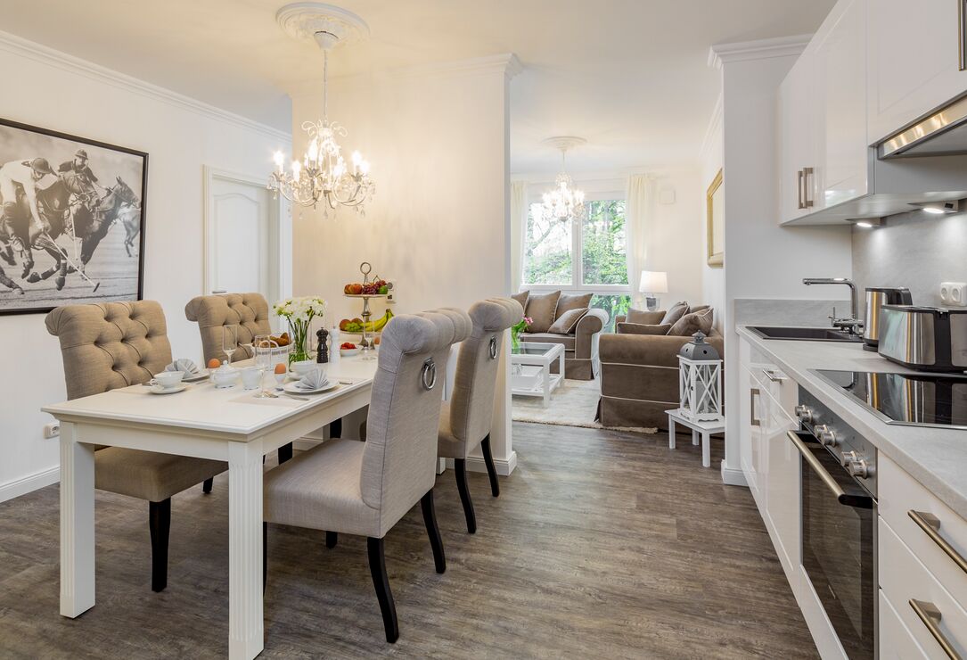 3-Zimmerwohnung "Sunrise Suite", 2 Bäder, 2 Schlafzimmer, Tiefgaragenstellplatz (Durchfahrtshöhe 2,10 m) in der Strandvilla Augustusbad, bis zu vier Personen.