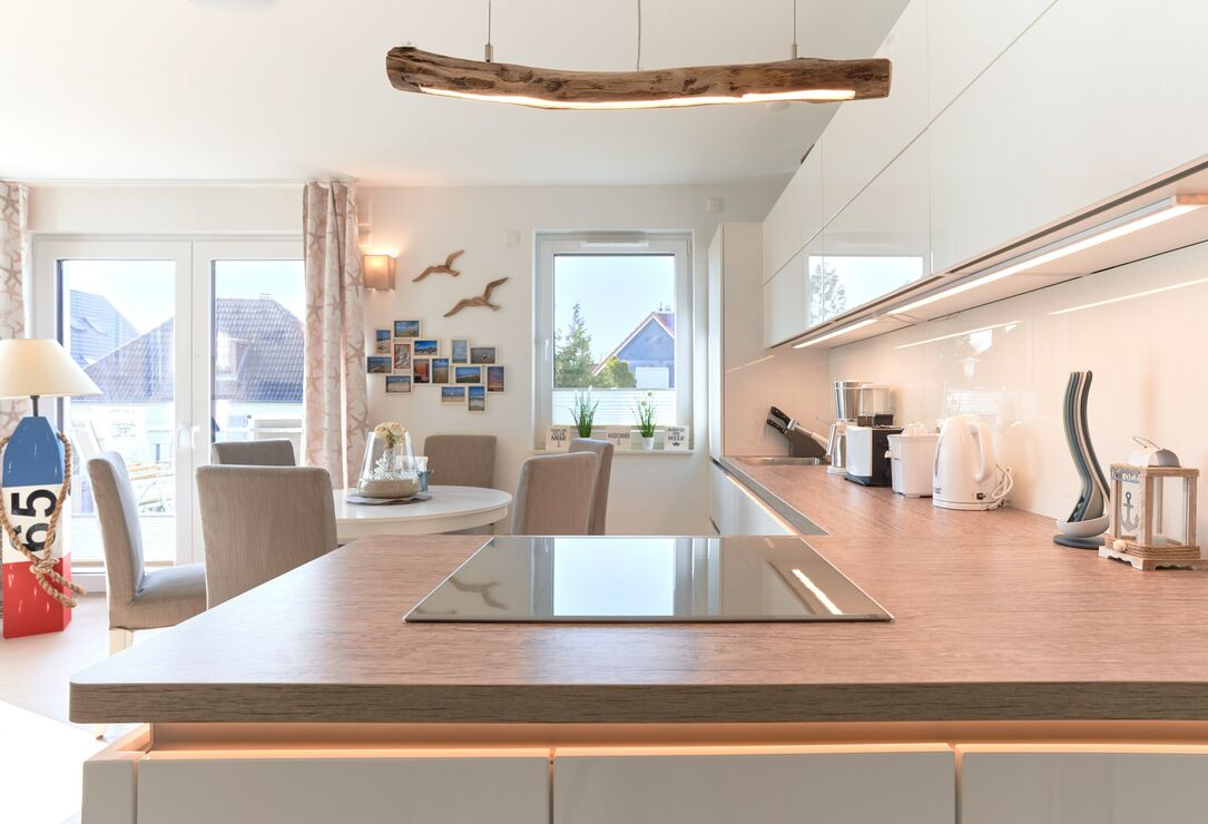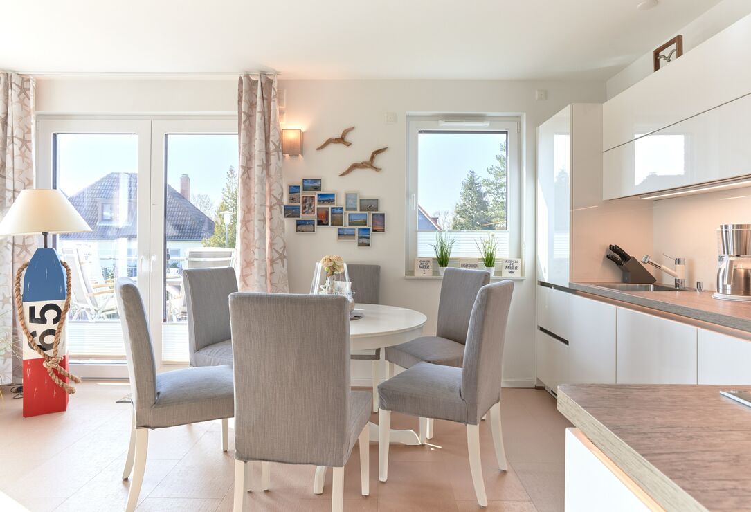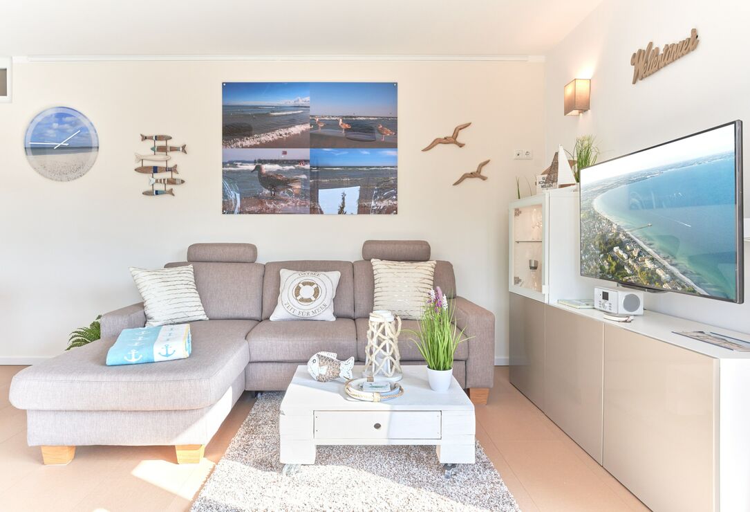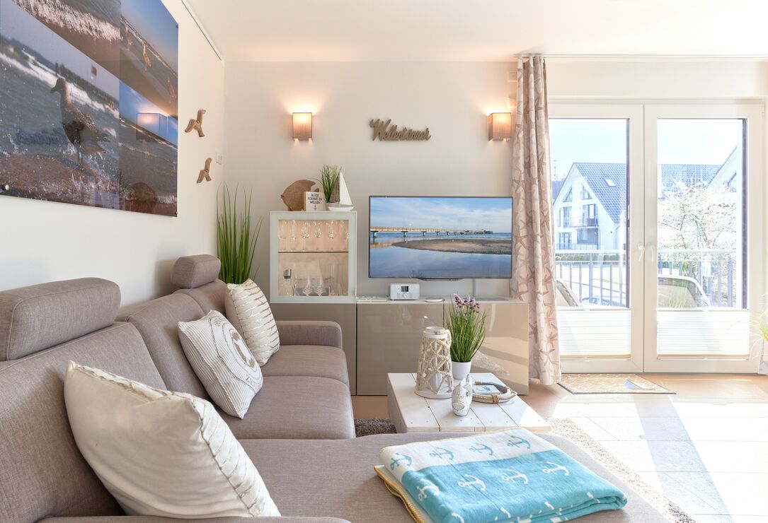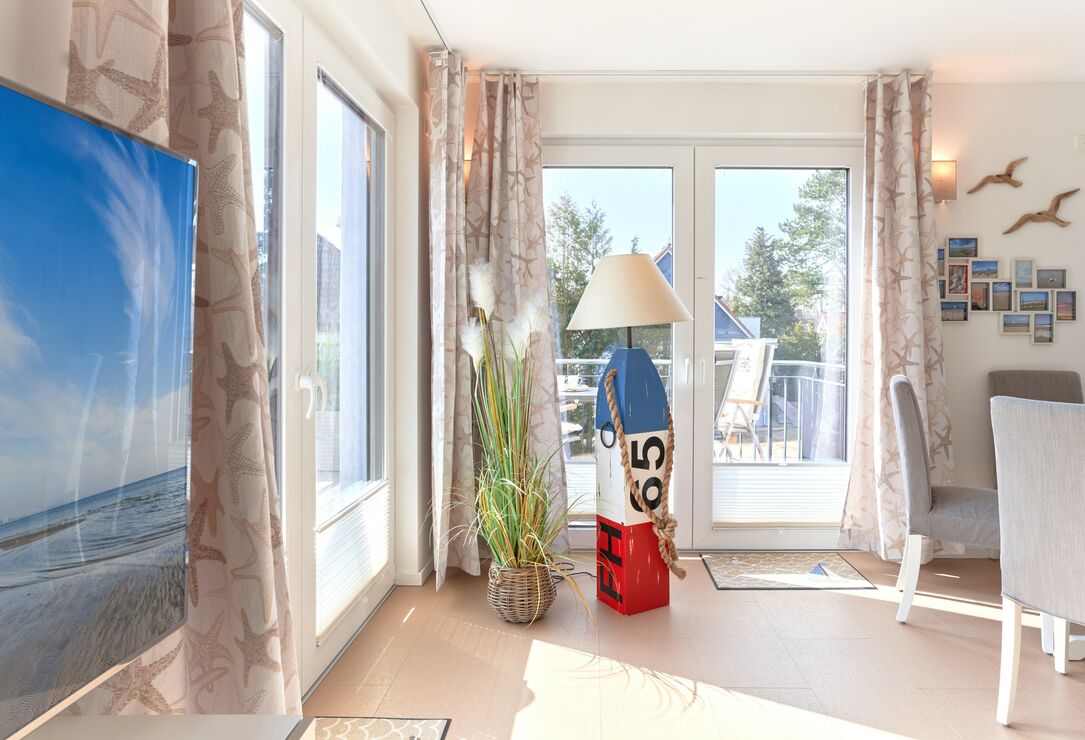 Genießen Sie Ihren Urlaub in dieser lichtdurchfluteten Ferienwohnung. Es warten auf Sie drei Schlafzimmer; 1. Schlafzimmer mit einem Doppelboxspringbett, 2. Schlafzimmer mit zwei Einzelboxspringbetten sowie ein 3. Schlafzimmer mit einem Einzelboxspringbett. Alle Zimmer lassen sich durch Außenrollläden verdunkeln, auch sind die Schlafzimmer je mit einem TV ausgestattet. Im Wohn-Essbereich erwartet Sie eine großzügige, helle sowie sehr gut ausgestatte Küche. Angrenzend ist der Essbereich, hier lässt es sich sehr gut sitzen, auch für lange Spielabende. Der Wohnbereich ist mit einem bequemen Sofa eingerichtet. TV und Musikanlage sind selbstverständlich ebenso wie das kostenlose WLAN. Auf dem Balkon stehen Ihnen zwei Liegen sowie ein Tisch mit vier Stühlen zur Verfügung. In heller Optik gehaltenes Duschbad mit bodengleicher Dusche, Handtuchheizkörper, Fön, Kosmetikspiegel.