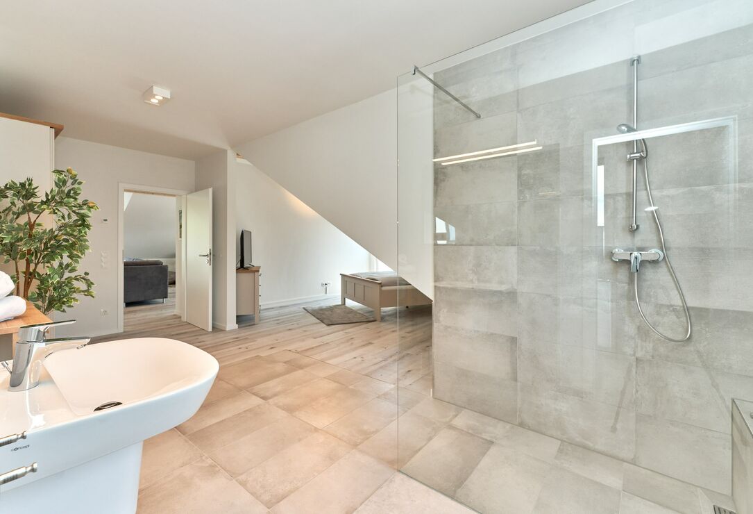 Das zweite Schlafzimmer hat ebenfalls ein Doppelbett mit Einzelmatratzen und verstellbarem Kopf- und Fußteil. Ein Smart-TV ist auch hier vorhanden. Das zweite Tageslichtbad ist mit einer bodengleichen Dusche ausgestattet. Das dritte Schlafzimmer ist mit zwei Einzelbetten und einem Smart-TV ausgestattet.